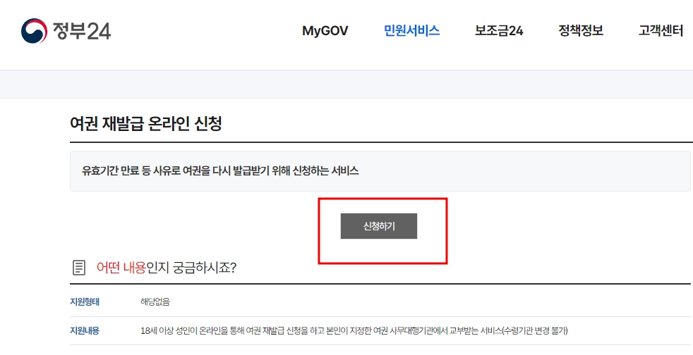 - 정부24 접속: 정부24 웹사이트에 접속합니다. 정부24는 다양한 정부 민원 서비스를 제공하는 플랫폼으로, 여권 재발급 외에도 여러 서비스를 이용할 수 있습니다.
